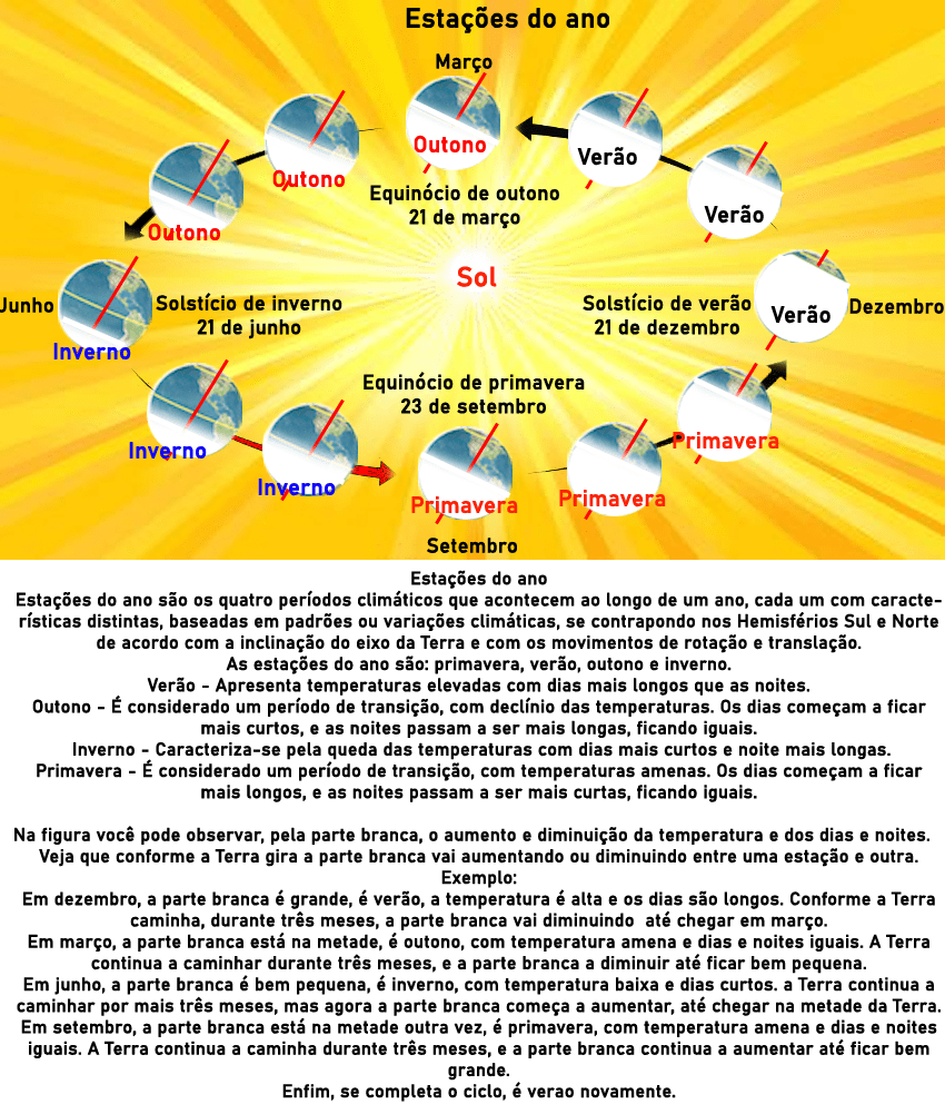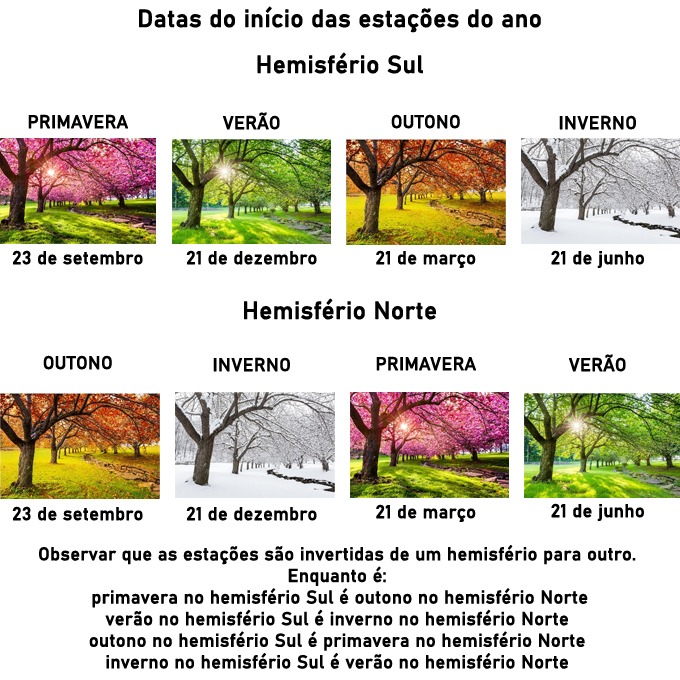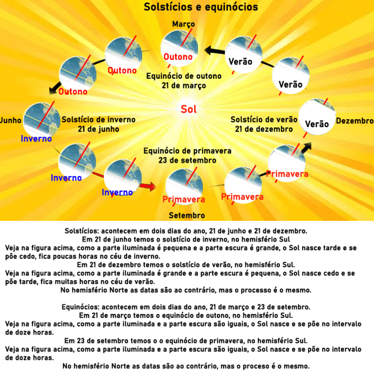 São os equinócios e os solstícios que determinam as mudanças das estações do ano, em setembro começa a primavera no hemisfério Sul e o outono no hemisfério norte. Em dezembro começa o verão no hemisfério Sul e o inverno no hemisfério Norte. Em março começa o outono no hemisfério Sul e a primavera no hemisfério Norte. Em junho começa o inverno no hemisfério Sul e o verão no hemisfério Norte.