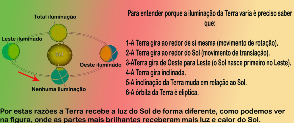 Nós já sabemos que a Terra é redonda, gira ao redor de si mesma, e ao redor do Sol inclinada e como ela gira sobre si mesma e ao redor do Sol, enquanto uma metade está iluminada e aquecida pelos raios solares a outra metade esta no escuro e sem calor. Isto é o Dia e a Noite.