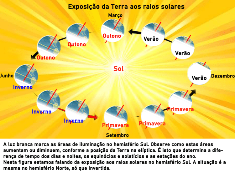 Comecemos a andança da Terra em dezembro, no solstício de verão, quando temos o início do verão, que durante três meses vai reger o clima no hemisfério Sul. Nestes três meses, conforme a Terra caminha, a temperatura e as características do clima de verão irão mudando até chegar no outono, em março.