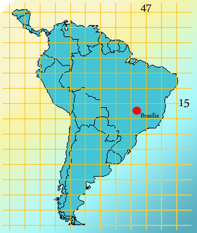 A posição de Brasília é: 15⁰ 46’ 48’’S e 47⁰ 55’45″O.