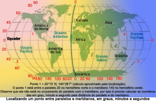 Como o ponto não está no cruzamento do paralelo com o meridiano, ele vai tomar o número do paralelo e do meridiano mais próximos. Este número será dado em grau.