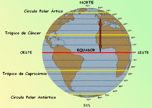 Na figura abaixo você pode ver a numeração dos paralelos acima e abaixo da linha do Equador.
