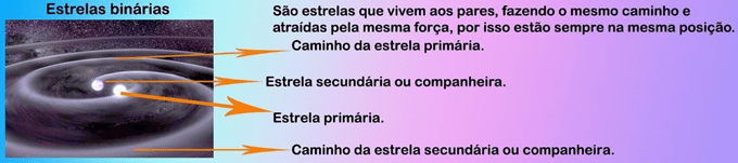 As estrelas que estão em par, uma ao lado da outra, girando da mesma forma, porque são atraídas pela mesma força, são chamadas estrelas binárias.
