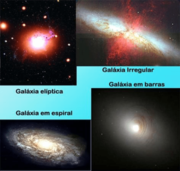 Existem várias formas de galáxias, como podemos ver na figura ao lado. A Via Lactea é uma galáxia espiral.