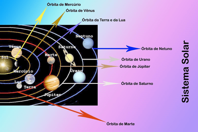 Vemos também linhas que formam o caminho de cada planeta. É o que se chama órbita de um planeta.