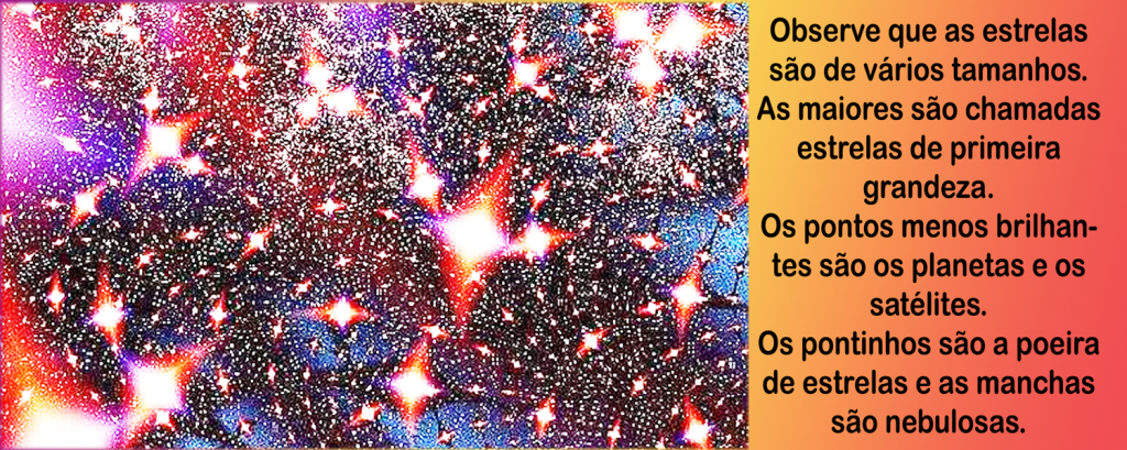 Pois é! Há bilhões e bilhões de anos atrás, houve, no céu, uma explosão muito, mas muito grande mesmo, imensamente maior do que as que se vê, que atirou cacos por todos os lados. Mas estes cacos não foram de vidro, madeira ou cimento, foram bolas de fogo, que se espalharam por todo o céu.