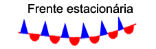 Uma frente estacionária é representada simbolicamente como aparece na figura abaixo, através de uma linha sólida, com triângulos azuis que apontam para o ar quente e semicírculos vermelhos que apontam para o ar frio.