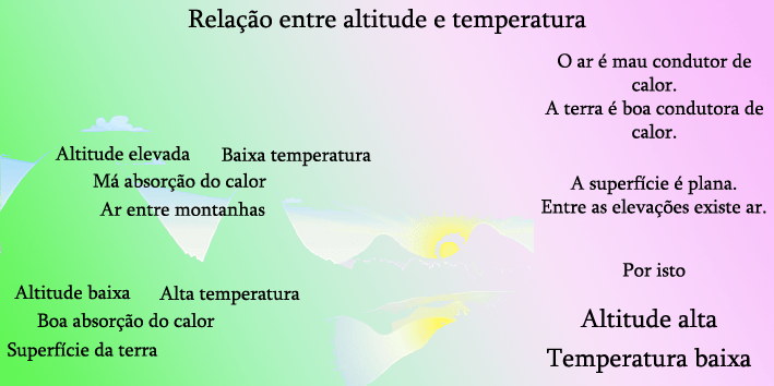 Como já vimos, a pressão diminui com a altitude, portanto o relevo influencia no clima com a mudança de altitude. Assim, no alto de uma montanha o clima será diferente do clima em uma planície. As áreas de altitude mais elevada são mais frias do que as de altitude mais baixa, e, também mais secas, pois as montanhas podem impedir que os ventos com umidade cheguem à região, tornando o clima mais seco.
