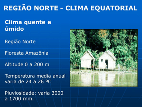Como exemplo temos o tipo de clima equatorial, na região do equador, dentro da zona tropical, como também temos o tipo de clima tropical dentro da mesma zona, cada tipo de clima diferente um do outro.