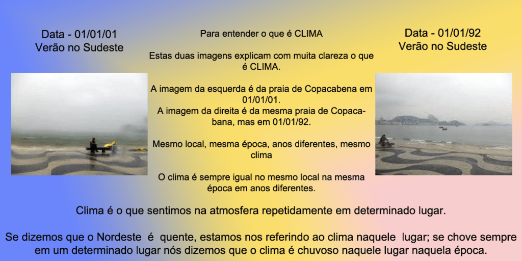 Se dizemos que o Nordeste é quente, estamos nos referindo ao clima naquele lugar; se chove sempre em um determinado lugar nós dizemos que o clima é chuvoso naquele lugar naquela época.