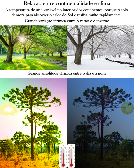 Conclusão: A temperatura do ar é variável no interior dos continentes, porque o solo demora para absorver o calor do Sol e resfria muito rapidamente.