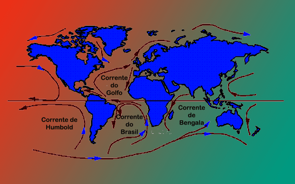 As correntes quentes formam-se na zona intertropical, próxima à Linha do Equador, e movimentam-se em direção às zonas polares. As correntes frias formam-se nas zonas polares e movimentam-se em direção à região equatorial.