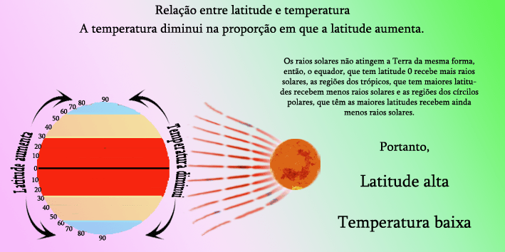 Observe esta relação: menor latitude maior temperatura, maior latitude menor temperatura.