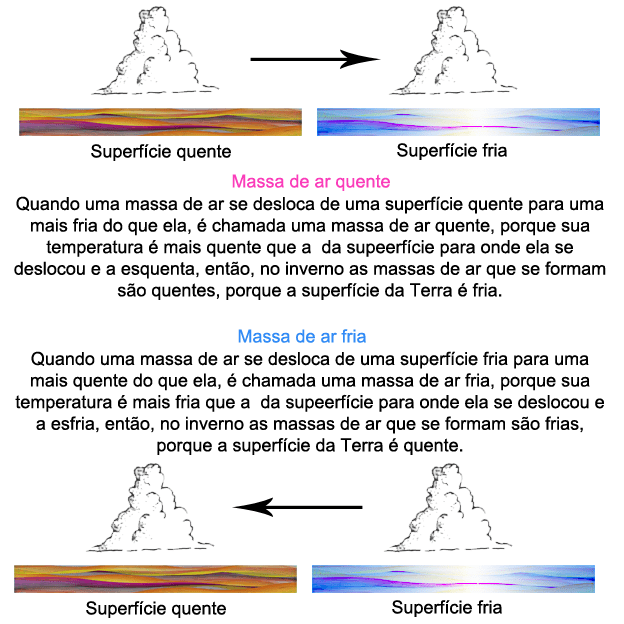 Se a superfície está mais quente do que ela, é chamada uma massa de ar frio, porque sua temperatura é mais fria que a da superfície e a resfria, então no verão as massas de ar são frias, porque a superfície da Terra é quente.