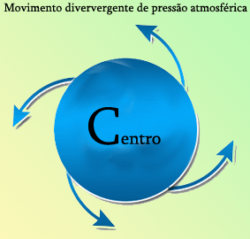 Características da alta pressão atmosférica: movimento divergente do centro, tirando a umidade, o que evita a formação de nuvens e desfavorece a chuva.