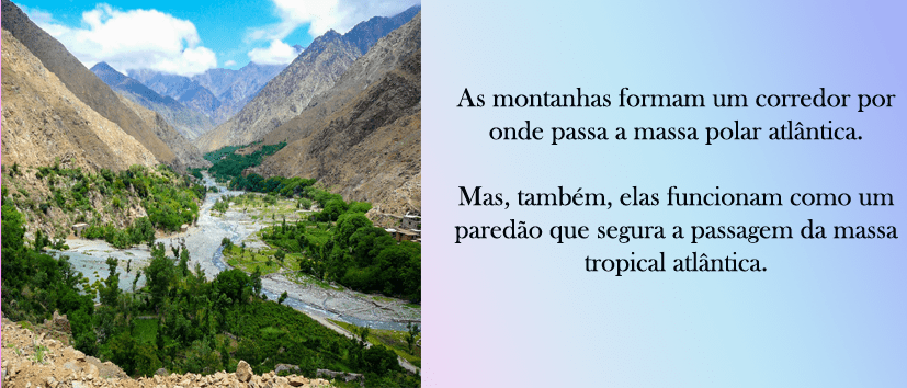 No Brasil, por exemplo, as serras no Centro-Sul do país formam uma “passagem” que facilita a circulação da massa polar atlântica e dificulta a massa tropical atlântica.