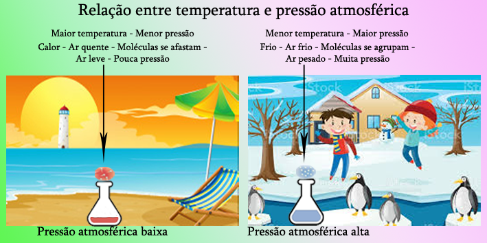 Observe esta relação: menor temperatura maior pressão atmosférica, maior temperatura menor pressão atmosférica.