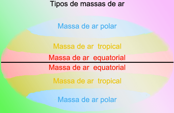 As massas de ar podem, de acordo com a região onde surgem, ser quentes, frias, úmidas ou secas.