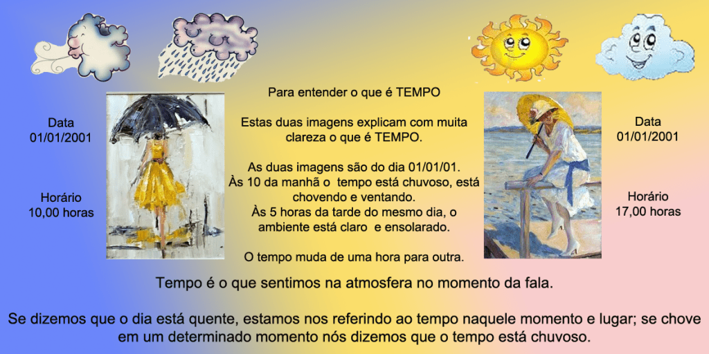 Se dizemos que o dia está quente, estamos nos referindo ao tempo naquele momento e lugar; se chove em um determinado momento nós dizemos que o tempo está chuvoso.