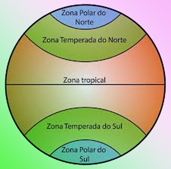 A figura a seguir mostra a divisão do planeta em zonas climáticas que são faixas de latitude conforme o calor que recebem do Sol. Elas são em número de cinco.