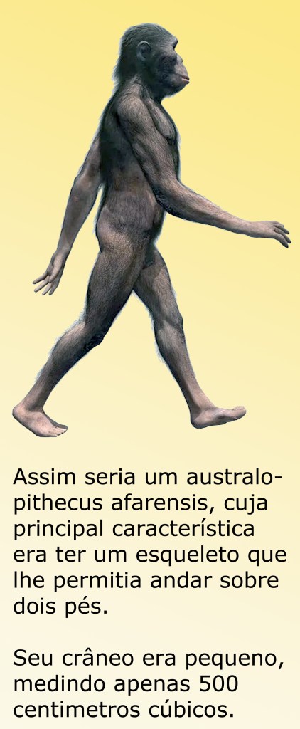Os australopithecus afarensis tinham um cérebro minúsculo, mas andavam de pé, como nenhum macaco seria capaz de fazer e os humanos fariam melhor num futuro distante.
