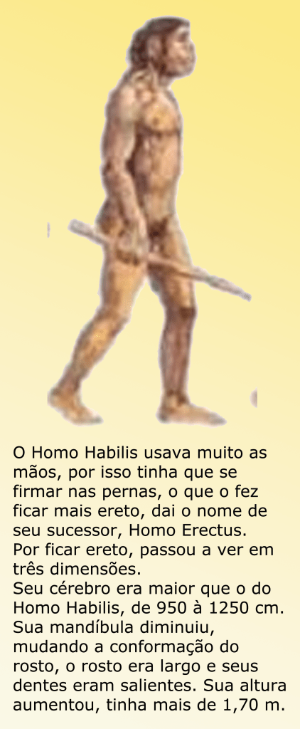 Durante milhares de anos o Homo Habilis foi evoluindo. Como usava as mãos para fazer ferramentas tinha apenas as pernas para se sustentar, o que fez com que ficasse com o corpo ereto, por isso foi chamado de Homo Erectus. Por ficar ereto, passou a ver em três dimensões.