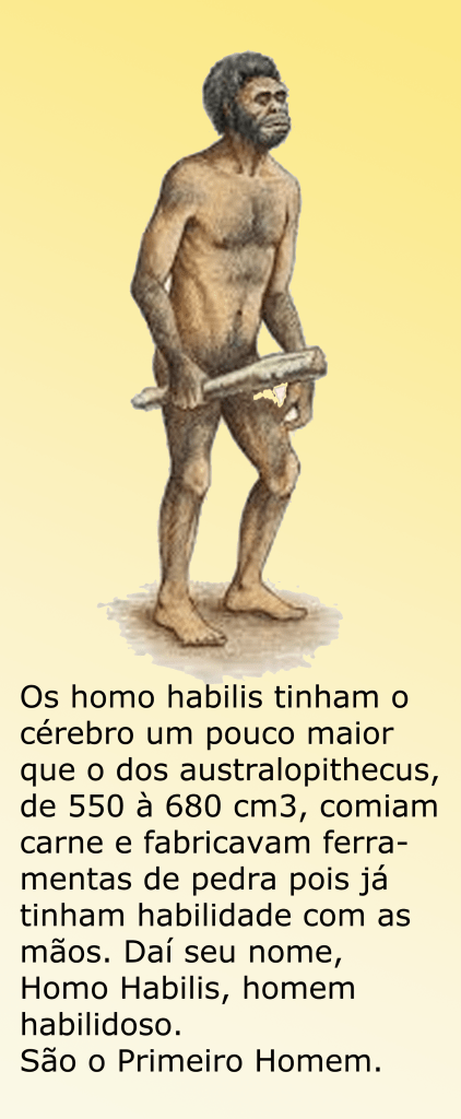 Os homo habilis tinham o cérebro um pouco maior que o dos australopithecus, de 550 à 680 cm3, comiam carne e fabricavam ferramentas de pedra pois já tinham habilidade com as mãos. Daí seu nome, Homo Habilis, homem habilidoso.