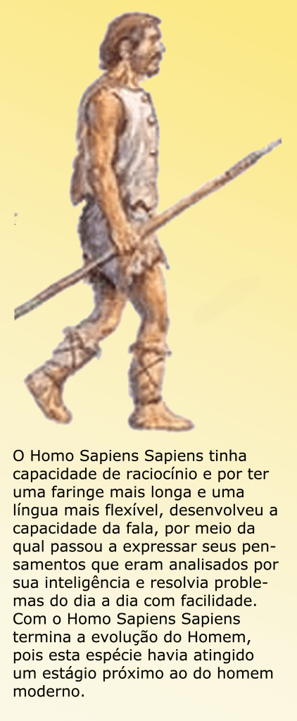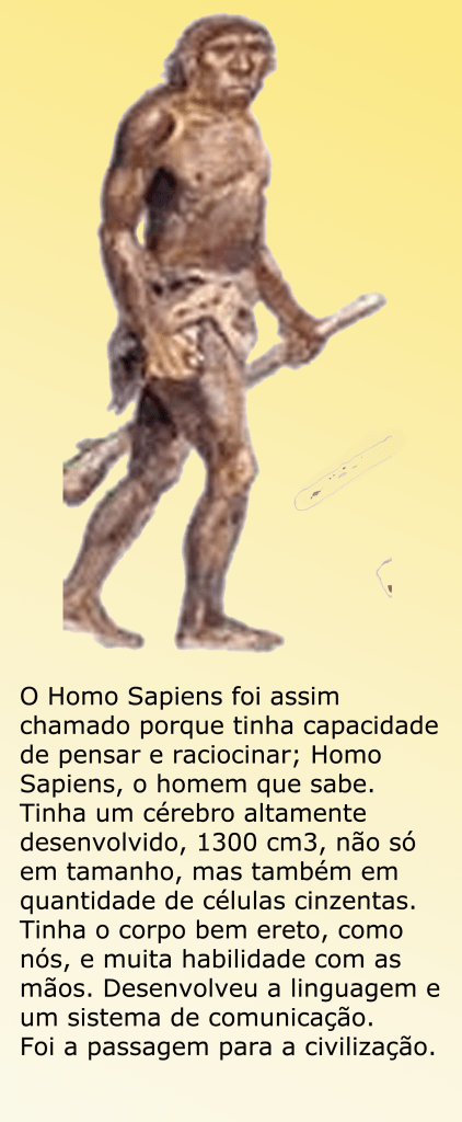 Ao mesmo tempo em que o Homo Erectus desaparecia, há 300 mil anos atrás, dele evoluía uma nova espécie, que foi chamada de Homo Sapiens porque tinha capacidade de pensar e raciocinar; Homo Sapiens, o homem que sabe.