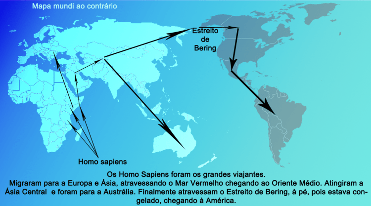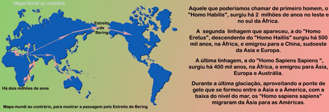 Só faltava atingir a América, o que foi feito há cerca de 15.000 anos, atravessando o Estreito de Bering, chegando no Alasca.