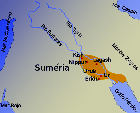 Veja no mapa a seguir onde se localizaram os sumérios, dentro da Mesopotâmia.